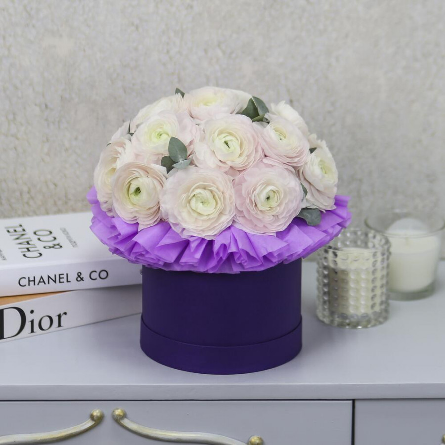 На фото 17 белых ранункулюсов в шляпной коробке. В составе: ранункулюс 17 шт, эвкалипт 2 шт, шляпная коробка (s) 1 шт, . Все цветы свежие и ароматные, букет красиво оформлен и отлично подходит для подарка. Доступна доставка цветов или самовывоз.