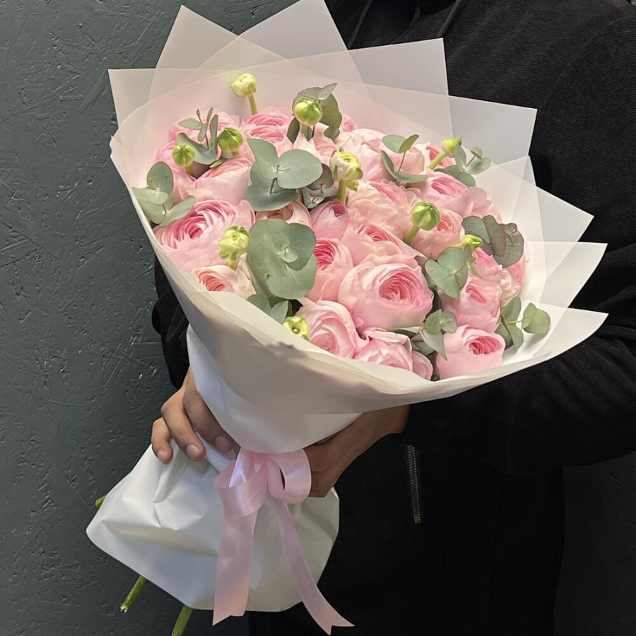 Букет из 29 розовых ранункулюсов с эвкалиптом в Батайске