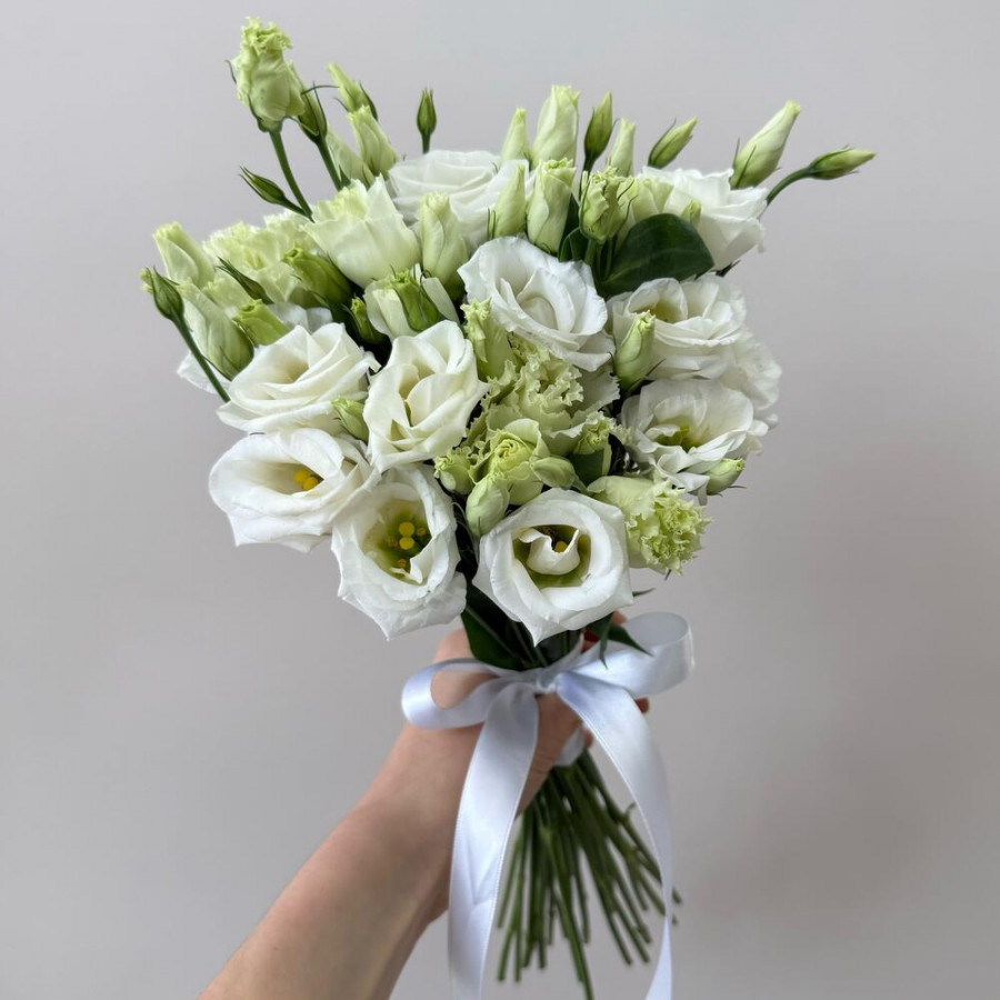 На фото букет из белых эустом для невесты. В составе: эустома (лизиантус) 5 шт, атласная лента 2 шт, . Все цветы свежие и ароматные, букет красиво оформлен и отлично подходит для подарка. Доступна доставка цветов или самовывоз.