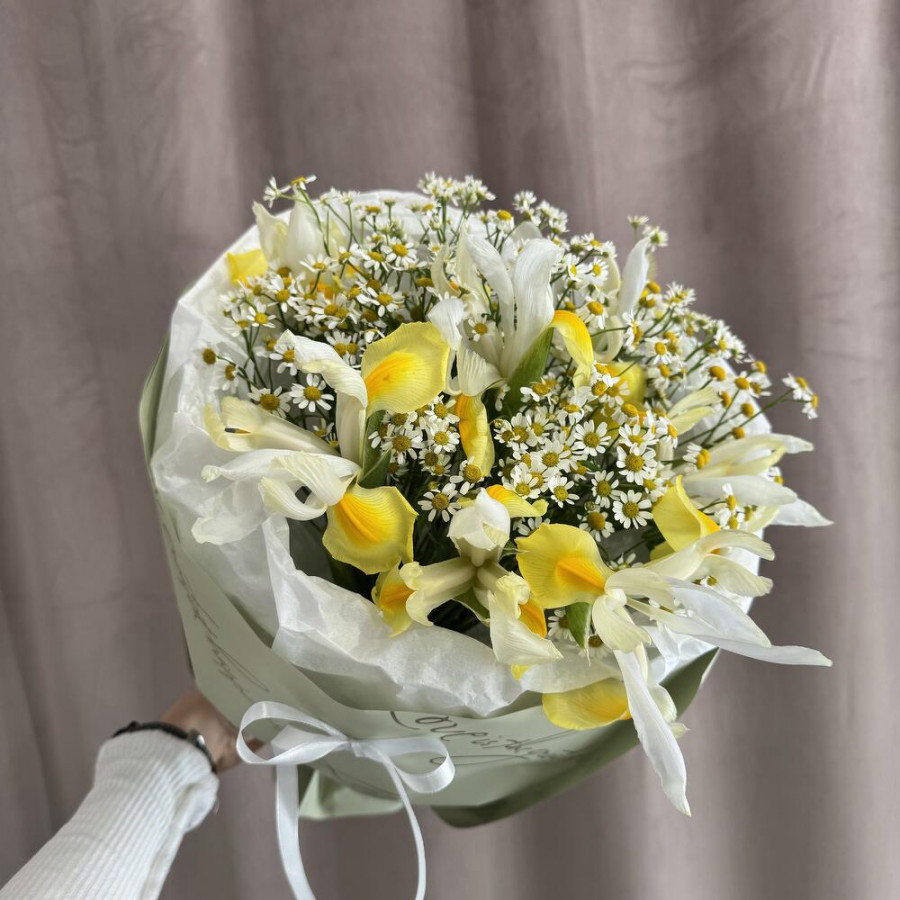 На фото букет из желтых ирисов и ромашек. В составе: ирис 7 шт, танацетум 10 шт, дизайнерская упаковка 2 шт, атласная лента 2 шт, . Все цветы свежие и ароматные, букет красиво оформлен и отлично подходит для подарка. Доступна доставка цветов или самовывоз.